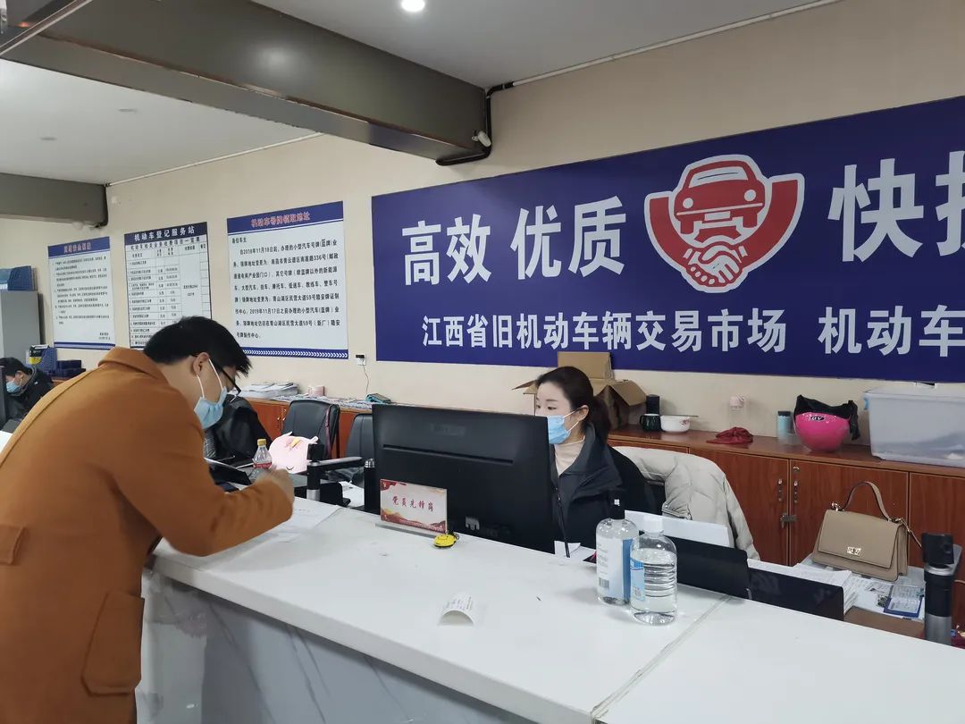 图为江苏旧车办证大厅党员先锋岗在提供服务